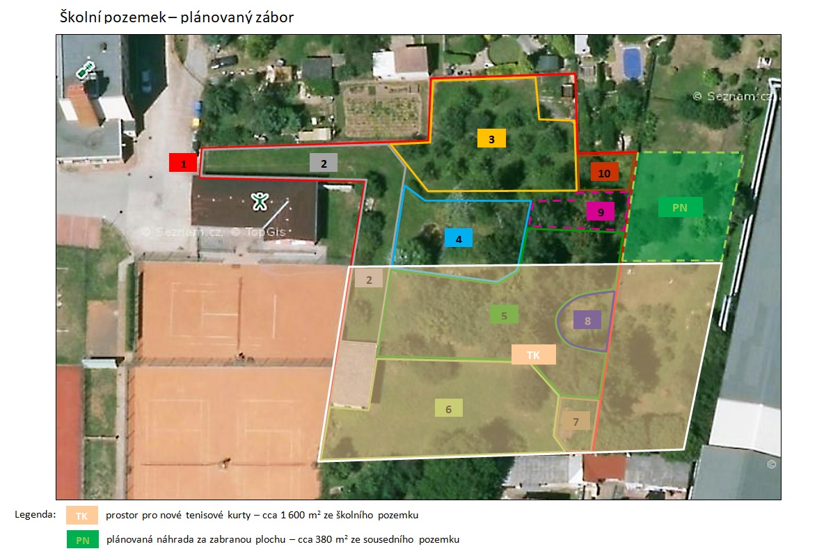 V současné době je však plánován zábor podstatné části školního pozemku a její proměna ve dva až tři tenisové kurty. Plánovanou situaci si můžete prohlédnout na přiloženém plánku. Za zabraných cca 1 600 m2 plochy má být škole nabídnut přilehlý pozemek o výměře cca 380 m2. Již v současnosti jsme nemohli vysadit všechny původně zamýšlené druhy, na novou výměru se nám pak v žádném případě nevejdou ani druhy stávající. Zároveň nutno podotknout, že po nové výsadbě by stromy začaly plnit funkci lesa přibližně za patnáct let. Adekvátní náhradu tak škola nemůže dostat.
